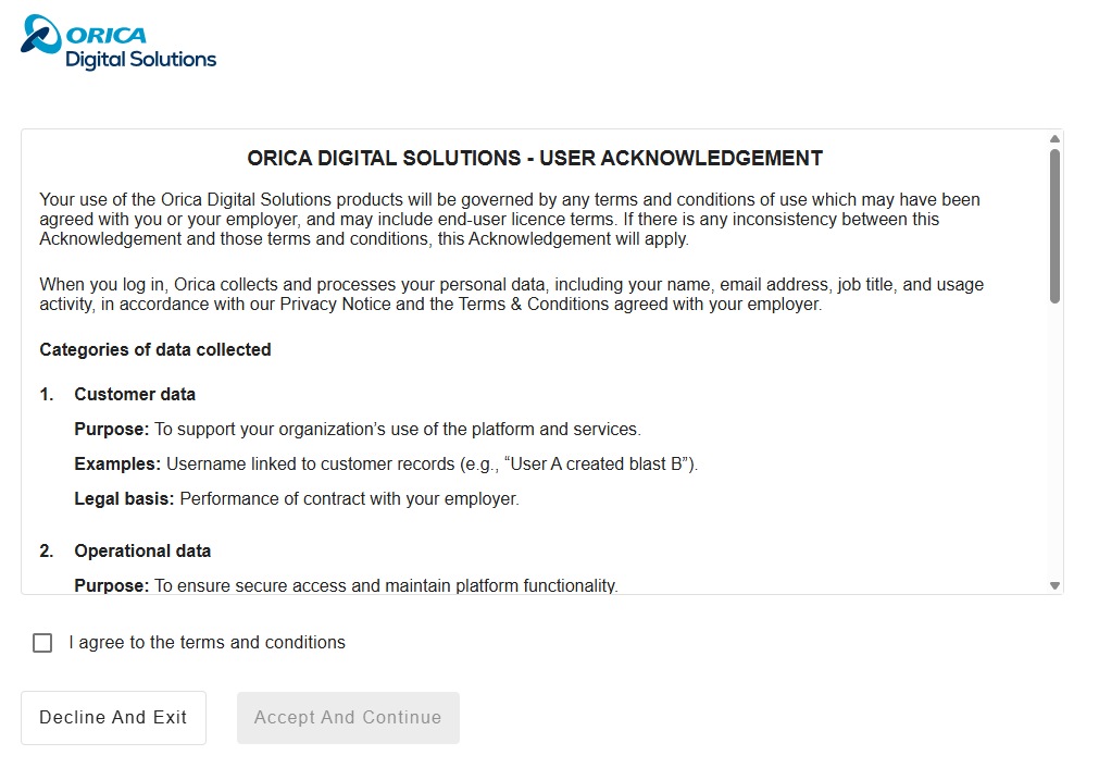 When you log in, Orica collects and processes your personal data, including your name, email address, job title, and usage activity, in accordance with our Privacy Notice and the Terms & Conditions agreed with your employer.