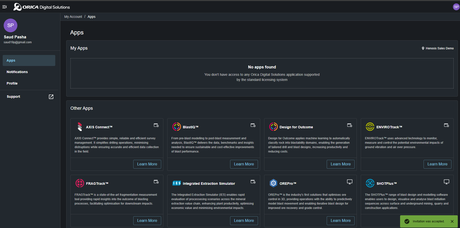 If you select "Accept and Continue" you will be directed to Orica Digital Solution Platform(ODS) where you can access different digital solutions in ODS.